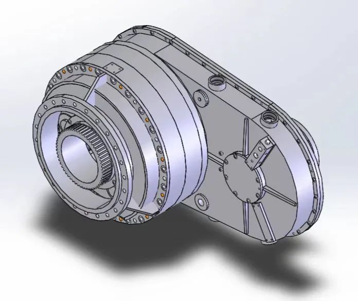 该齿轮箱应用于某石油单位研发用车载压裂泵,总重量1.8T,输出马力2088hp。齿轮箱为一级平行级+行星齿轮传动,采用拼装人字齿设计,大大降低了安装空间和重量,实现了较窄空间中大中心距超高功率密度传动,为我司进军石油机械行业奠定了重要基础。