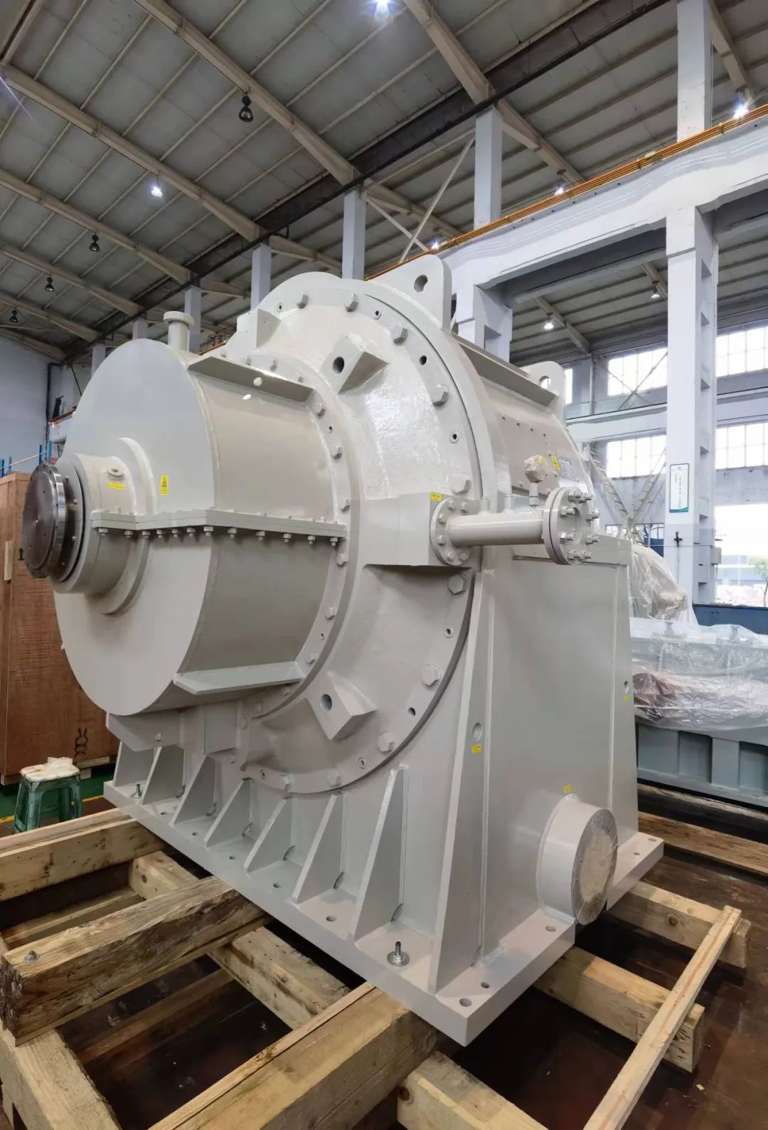 该齿轮箱应用于新型二氧化碳储能工程验证项目关键设备,在用电低谷期,利用多余电力将常温、常压的二氧化碳气体压缩为液体,在用电高峰期,利用存储的热能加热液态二氧化碳至气态,驱动汽轮机发电。该齿轮箱为多轴输出结构,输出功率为11MW,节圆线速度138.5m/s,大齿轮直径约2m,加工精度要求高,属于精密大型薄壁件齿轮,加工难度较高。该台齿轮箱无论是设计、制造均达到国内水平,为多轴齿式压缩机或膨胀机的国产化奠定了基础。